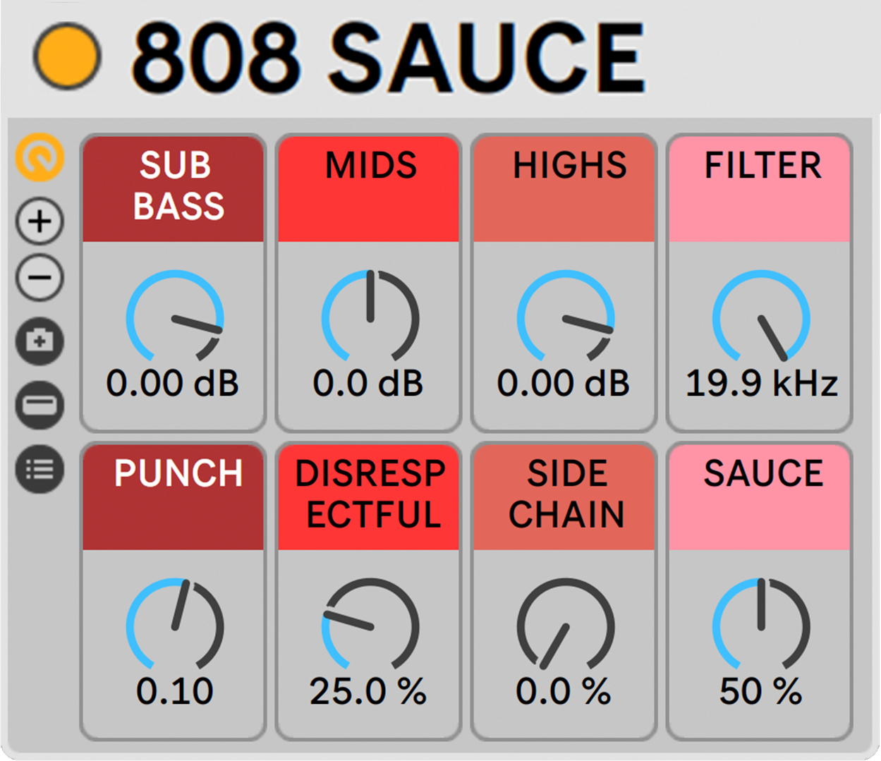 808 Sauce uses 100% Stock Ableton Plugins organized in an Audio Effect Rack with 8 Pre-Mapped Macro Controls for easy mixing.